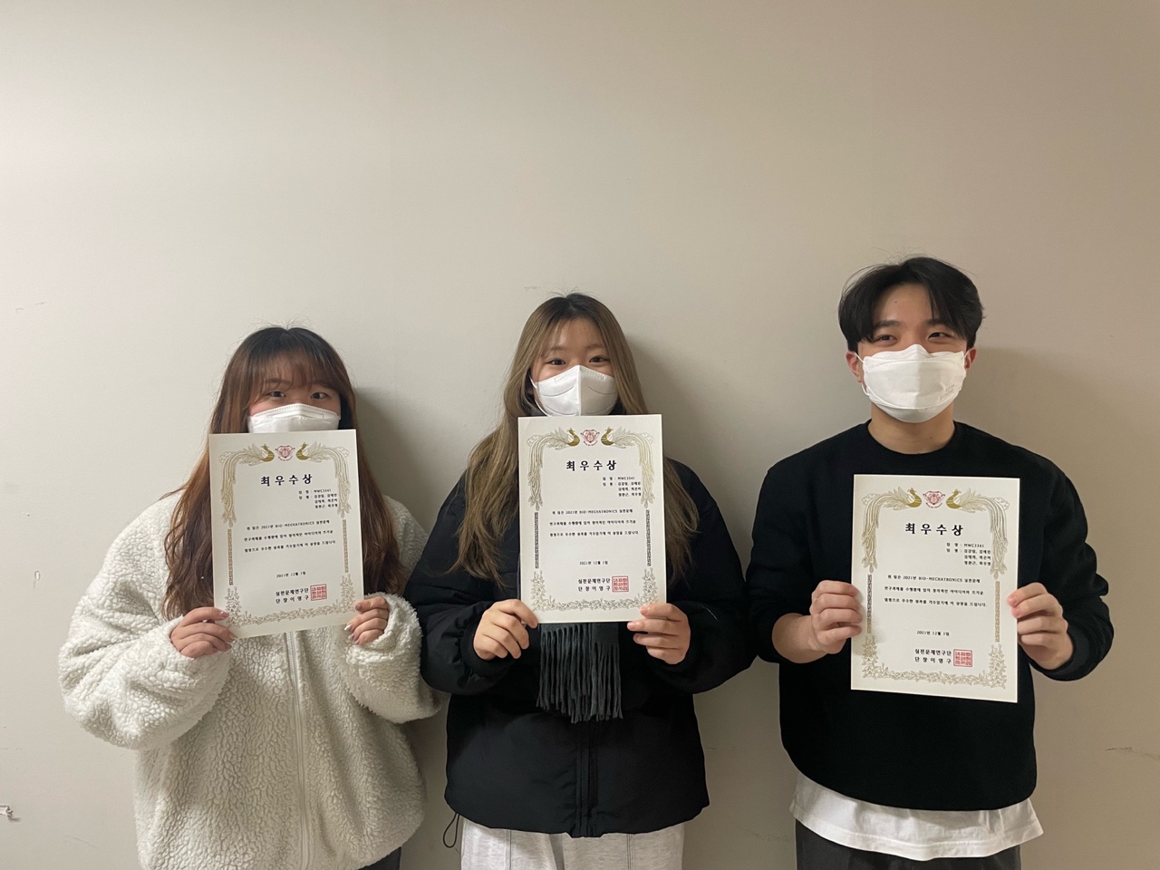 지난 12월 1일 경희대학교 실전문제연구단 성과 발표회에서 생체의공학과 이상민 교수님 연구실의 NWC3441팀이 1등이라는 성적을 거머쥐게 되었습니다. 16학번 정완근 학우와 19학번 김예린 학우, 김태희 학우, 최우정 학우와 최은비 학우가 ‘근거리 무선통신(NFC)를 이용한 웨어러블 멀티채널 패치 개발’에 대해 지난 1년간 연구를 하였습니다. 해당 프로젝트를 진행하며 ICEE ASIA 학회에 참석하여 논문을 게재하였고, 프로젝트 발표 결과 실전문제연구단 경진대회에서도 최우수상이라는 성과를 냈습니다. 프로젝트의 내용은 cut and paste 방식으로 제작한 flexible한 패치를 피부에 부착한 후, 다채널 근전도 센서와 NRF를 이용한 무선 통신을 통해 주변 사물을 제어하는 방식을 제공하는 것입니다.